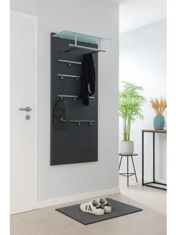 Modernes Wandgarderobenpaneel mit einem Glasboden aus Sicherheitsglas, darunter chromfarbene Kleiderstange aus Stahlrohr. Auf dem Paneel sind insgesamt 4 chromfarbene Metallleisten aufgesetzt, mit insgesamt 8 Kleiderhaken, die individuell angebracht werden können. Paneele ist aus MDF, schwarz beschichtet. Ohne Dekoration. Im Lieferumfang ist die Paneele wie beschrieben. Gesamtmaße ca. cm: B. 60 x H. 120 x T. 26- Mit vielen Ablagefunktionen- Optische, edle Oberflächen- Sicherheitsglasablage