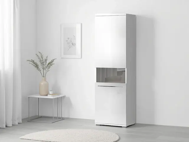 Aluminiumhöhenverstellbare Füße. Soft-Close-Funktion. Hochglanz UV lackiert, besonders kratzfest. Chromgriff. FSC®-zertifizierter Holzwerkstoff