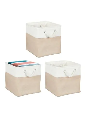 Mit diesem rechteckigen Aufbewahrungskorb im 3er Set holst Du Dir einen praktischen und zugleich dekorativen Ordnungshelfer nach Hause. Ob als Badezimmerkörbe für Handtücher, Regalkörbe für Socken und Unterwäsche im Schlafzimmer oder andere Utensilien im Wohnzimmer – dank der geräumigen Größe lassen sich alle Kleinigkeiten des Alltags übersichtlich in den Ordnungskörben verstauen. Dabei überzeugen die Aufbewahrungsboxen mit ihrem zweifarbigen Design aus Leinen.Aufbewahrungskorb im Detail – Maße Korb A H x B x T: ca. 28 x 28 x 28 cm / ca. 400 g – Maße Korb B H x B x T: ca. 30 x 30 x 30 cm / ca. 450 g – Maße Korb C H x B x T: ca. 33 x 33 x 33 cm / ca. 540 g – Material: Leinen, Baumwolle, Eisen – Farbe: Beige, WeißVielseitige Schrankbox für mehr Ordnung – Vielseitiger Regalkorb für Wohn-, Schlaf- oder Badezimmer – Ideal für Kleidung, Handtücher, Spielzeug, Accessoires uvm. – Auch zum Verstauen von Accessoires, Spielzeug uvm. – Rechteckige Körbe passen ideal in Würfelregale – Zusammenfaltbar zum platzsparenden Verstauen – Mit robustem Metallrahmen für mehr Stabilität – Baumwollseilgriffe zum einfachen Tragen – Hochwertiger Leinenstoff – langlebig, leicht, reißfest und waschbar – Modernes, zweifarbiges Design für jeden WohnstilLieferumfang – 3x Regalkorb in Größe nach Wahl – Dekoartikel sind nicht im Lieferumfang enthalten
