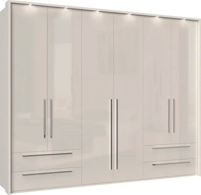 Nutze den Stauraum mit der großen Höhe von 226cm, in den Breiten 277 oder 322cm. Einlegeböden und Kleiderstangen sind individuell in der Höhe verstellbar.. Pflegeleichte, kratzfeste, sehr hochwertige Oberfläche durch UV Hochglanz- Lackierung. Mit höhenverstellbaren Füßen um Unebenheiten im Boden auszugleichen. Soft-Close-Funktion für ein leises und sanftes Schließen der Türen. Aus FSC-zertifiziertem Holzwerkstoff, Made in Europe