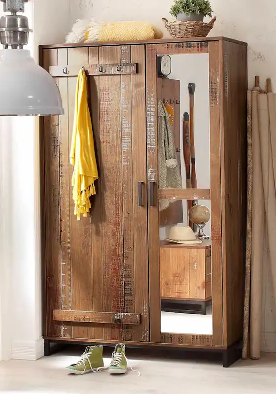 FSC®-zertifiziertes Massivholz: Kiefer. Gesamtmaße (B/T/H) ca. 110/52/180 cm. 1 Kleiderstangen. Mit 4 Ablageflächen. Tür mit Spiegelfront
