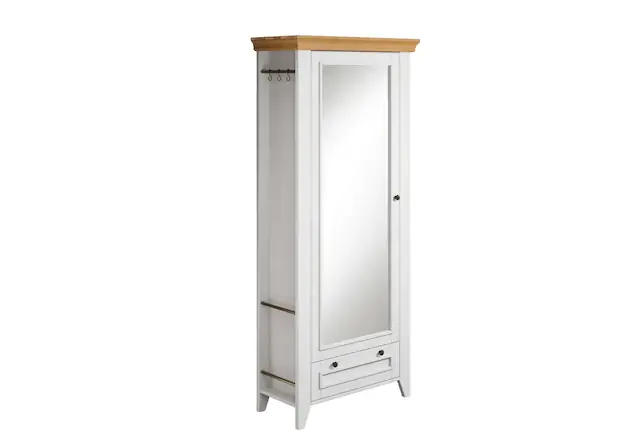 OTTO home – Idyllisch, gemütlich, maritim, rustikal: Der Landhausstil. Mit der natürlichen Schönheit der massiven Kiefer. Großes Spiegelpaneel für einen Kontrollblick vor dem Ausgehen. Mit einer Kleiderstange, einem Schubkasten und drei Schienen in jedem Schrankseitenteil für Aufhängemöglichkeiten von Kleidung oder zum Abstellen von Hausschuhen an der Seite. Beeindruckende Optik durch spezielle Fußform und fein gefräste Kranzleiste