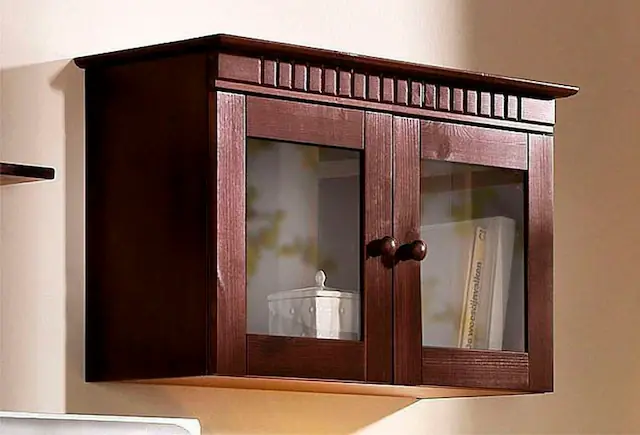 Hängevitrine im Landhaus-Stil. Vitrine aus massiver Kiefer. Mit dekorativen Fräsungen. Außenmaße (B/T/H): 70/28/43 cm. FSC®-zertifiziert