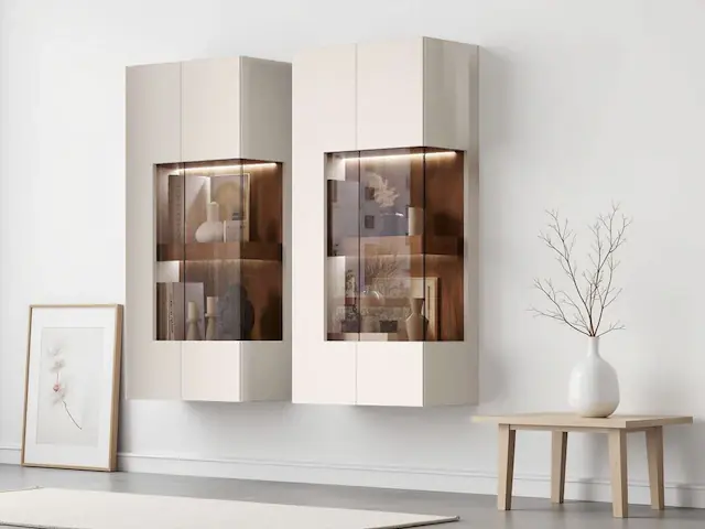 Hängeschrank mit Glastür und LED-Beleuchtung. Lackiert mit wasserbasiertem UV-Lack. Die Oberkante der Tür ist im 45-Grad-Winkel geschnitten. Soft-Close-Funktion. Mit Beleuchtung und Parsol-Braunglas