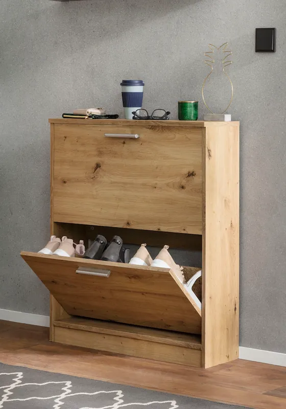 Maße B/T/H 75/21/83 cm. 2 Klappen. Für 8 Paar Schuhe