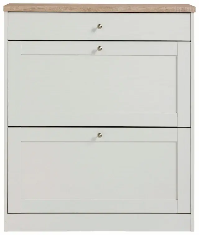 Maße (B/T/H): 90/25/103 cm. FSC®-zertifiziert. Mit 2 Klappen für ca. 12-16 Paar Schuhe. 1 Schubkasten