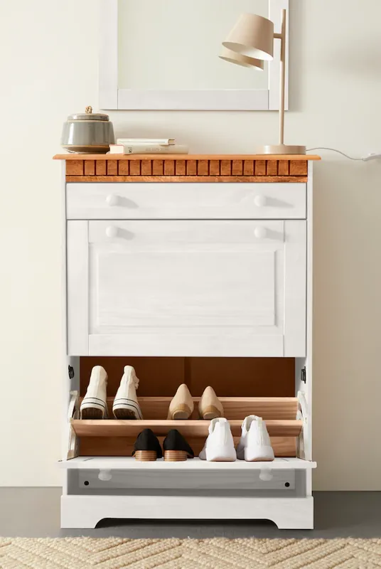 OTTO home – Landhausmöbel von vintage bis modern. Aus schönem massivem Kiefernholz. Platz für 5-7 Paar Schuhe pro Klappe. Mit Schubkasten und 2 Klappen. Gesamtmaße (B/T/H) ca. 75/30/105 cm