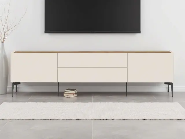 Pflegeleichte Oberfläche. Lackiert mit wasserbasiertem UV-Lack, besonders kratzfest. Die Oberkante der Tür ist im 45-Grad-Winkel geschnitten. Soft-Close-Funktion. FSC®-zertifiziertes Massivholz