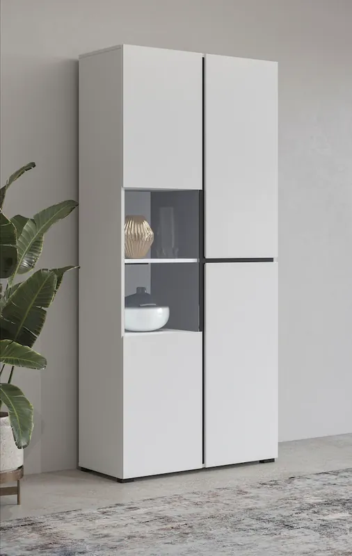 Die Vitrine Cross aus hochwertigem FSC-zertifiziertem Holzwerkstoff vereint modernes Design. Dank seiner grifflosen Oberfläche fügt es sich nahtlos in jeden Raum ein, die farblich abgesetzte Kreuzoptik verleiht dem Schrank einen trendigen Look.. Mit großzügigem Stauraum, 1 Glastür und 2 Holztüren bieten es ausreichend Platz für Ihre persönlichen Gegenstände. Die hochwertige Verarbeitung mit Metallbeschlägen und Melaminbeschichtung verspricht Langlebigkeit. Maße 79,5×183,5×40 cm (BxHxT). Der zeitlose Look und die verschiedenen trendigen Farben der Serie garantieren eine stilvolle Einrichtung. Praktisch & Simple