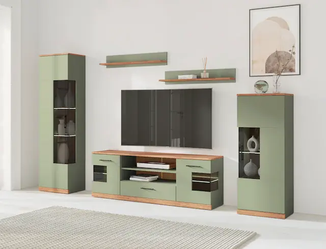 Die Wohnwand besteht aus 5 Teilen, die aus einer Kombination von massiven Eiche Holz und Salbei grünen Melamin. Die Türe, die zum Teil mit dunklem Glas ausgestattet sind, machen die Wohnwand zu einem echten Hingucker. Die Griffe und Scharniere aus Metall verleihen der Wohnwand eine besonders langlebige Note. Mit ihren vielen Fächer ist die Wohnwand nicht nur ein optisches Highlight, sondern bietet auch viel Stauraum. Diese Wohnwand wurdein Europa produziert
