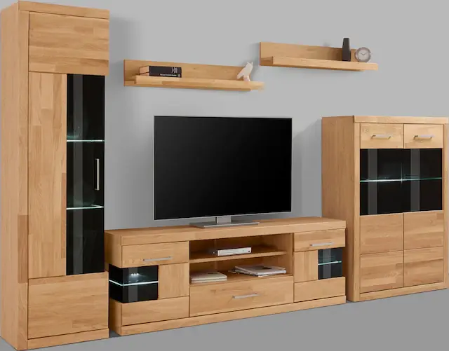 Wer auf der Suche nach wunderbaren Möbelstücken mit zahlreichen Kombinationsmöglichkeiten ist, wird die Wohnwand »Ribe« lieben. Die Komposition ist aus fünf Teilen zusammengesetzt und ausFSC®-zertifiziertem Massivholz sowie Holzwerkstoff gefertigt. Die Oberflächen sind somit besonders pflegeleicht und stehen außerdem für einen verantwortungsvollen Umgang mit Holzressourcen. Die einzelnen Teile sind frei platzierbar und bieten somit ein Höchstmaß an Möglichkeiten. Im Inneren der einzelnen Teile befinden sich zahlreiche Böden. Somit können lieb gewonnene Elemente entweder sichtgeschützt oder dekorativ verstaut werden. Aber auch als Dekomöbelstück mit Blumen oder Kerzen zeigen sich schnell die zahlreichen Qualitäten. Die Wohnwand »Ribe macht jedes Wohnzimmer zu einem optischen Highlight!