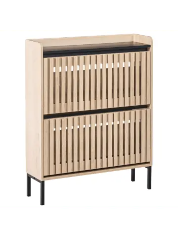 Schuhregal für 12 Paar Schuhe. Dieser funktionale Schuhschrank hilft Ihnen dabei, Ihren Flur ordentlich zu halten. Er verfügt über zwei herausklappbare Schubladen mit Trennwänden, in denen bis zu 12 Paar Schuhe Platz finden. So haben Sie alles griffbereit und übersichtlich aufbewahrt. Der Korpus aus MDF mit Melaminbeschichtung in Holzoptik wird durch geriffelte Fronten und Eisenbeine mit Schutzkappen ergänzt. Diese sorgen für Stabilität und schützen den Boden. Dank seines schlichten, praktischen Designs und seines skandinavisch inspirierten Looks fügt er sich nahtlos in Innenräume mit natürlichen Farbtönen ein.Details: Typ: Schuhschrank Farbe: Braun Farbton: Hellbraun Material: MDF-Platte Zusätzliches Material: Eisen Material Rand: Holzwerkstoff Gestellmaterial: Metall Tischplattenmaterial: Holzwerkstoff Finish: Melamin Schutzkappen / Filzgleiter: Ja Volumen: für 12 Paar SchuheDimensions: Tiefe: 25 cm Breite: 80 cm Höhe: 100 cm Gewicht: 20 kg Max. Belastung der Oberplatte: 10 kgSie kaufen: 1 x SchuhschrankProduktvorteile: Passt wunderbar zu jedem Einrichtungsstil, Traditionelles Design mit moderner Note, Stabile und solide Konstruktion, Schutzkappen zum Schutz des Bodens, Praktischer, großer StauraumMontage: Nicht montiert. 20 – 40 Min.Pflegeanleitung:MDF-Platte: 1.Bitte ausschließlich milde Reinigungsmittel und weiche Tücher verwenden. Feuchte Stellen sofort trocken reiben.Eisen: 1.Bitte ausschließlich handelsübliche, milde Reinigungsmittel und weiche Tücher verwenden, wobei feuchte Stellen sofort trocken gerieben werden sollten 2.Vermeiden Sie scheuernde Reiniger, da diese die Oberfläche beschädigen können 3.Bei Chrom und Kupfer regelmäßig mit speziellen Pflegemitteln polieren.