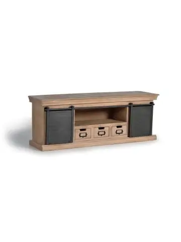 TV-Möbel 2 Schiebetüren und 3 Schubladen aus Mangoholz und Metall. Artikelmaße: 55 cm Höhe – 150 cm Länge – 150 cm Tiefe. Artikelgewicht: 45KG. Wood