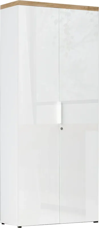 STAURAUM: Geräumiger Aktenschrank mit 5 Fächern (4 Einlegeböden) – perfekt für Ordnung in Büro, Homeoffice oder Wohnbereich.. OPTIK: Weiß Hochglanz trifft auf Eiche-Cadiz-Dekor – die gelungene Kombination aus moderner Eleganz und wohnlicher Ausstrahlung.. QUALITÄT: Robuste 38 mm Deckplatte, pflegeleichte Melamin-Oberflächen, stabile Metallbeschläge und FSC-zertifizierter Holzwerkstoff.. SICHERHEIT: Abschließbare Türen mit hochwertigem Metallgriff – für sicheren Stauraum im Arbeitszimmer oder in gemeinsam genutzten Bereichen.. KOMBINATION: Perfekt kombinierbar mit Schreibtischen und weiteren Möbeln der Serie – für ein einheitliches und funktionales Raumkonzept.