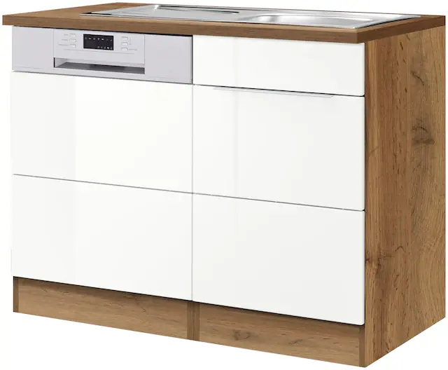 Maße (B/T/H): 110/60/85 cm. hochglänzende MDF-Fronten. inklusive Einbauspüle. Made in Germany. Ohne E-Geräte