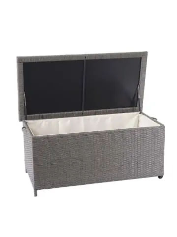 – Markeninhaber TÜV-Süd QM zertifiziert mit Nr. 12 100 59626 TMS für Qualitäts-Management in Deutschland – Lieferumfang: 1x Poly-Rattan Truhe – Variante wählbar: Premium oder Basic in verschiedenen Größen – Auch als Buffettisch nutzbar – BSCI-Sozialstandards geprüft – Premium: Müheloses Öffnen und Schließen durch leichtgängige Hydraulik – Premium: Wasserabweisender und abnehmbarer Bezug – Premium: Bezug mit Klettband befestigt – Premium: Beidseitig mit Griffen, einseitig mit Rollen versehen – Belastbarkeit bis ca. 40 kg – Überstehender Deckelrand schützt besser vor eindringender Nässe – Einlage im Deckel zur Verstärkung und Nässeschutz von oben – Durchgehendes Flechtwerk statt Spritzguss – UV- und wetterbeständigMaße Basic und Premium S (ca.):Höhe aufgeklappt: 97 cmHöhe zugeklappt: 51 cmBreite: 100 cmTiefe: 50 cmInnenmaße (HxBxT): 41x93x45 cmVolumen: 170l Maße Basic und Premium M (ca.):Höhe aufgeklappt: 105 cmHöhe zugeklappt: 51 cmBreite: 115 cmTiefe: 59 cmInnenmaße (HxBxT): 43x108x54 cmVolumen: 250l Maße Basic und Premium L (ca.):Höhe aufgeklappt: 110 cmHöhe zugeklappt: 63 cmBreite: 135 cmTiefe: 52 cmInnenmaße (HxBxT): 52x129x48 cmVolumen: 320l Maße Basic und Premium XXL (ca.):Höhe aufgeklappt: 168 cmHöhe zugeklappt: 80 cmBreite: 160 cmTiefe: 94 cmInnenmaße (HxBxT): 70x153x89 cmVolumen: 950l Material:Geflecht: Poly-RattanGestell: Pulverbeschichteter StahlEinlage im Deckel: PVCBezug (nur bei Premuim): Textil (100% Polyester), 180g/m² HINWEIS zum Volumen:Wir geben Ihnen die nutzbaren Liter an. Viele Anbieter geben angebliche Liter an, die bestenfalls ein Außenvolumen darstellen – darin wären dann aber sogar Griffe und heraus stehende Deckel integriert. Das ist für Sie nicht nutzbar. Von einer derart geschönten Darstellung nehmen wir Abstand. Die Truhe bietet jede Menge Stauraum für Ihre Gartenmöbel-Auflagen oder auch andere Dinge, die schnell, geschützt und gut belüftet verstaut werden sollen. Auch als Buffettisch gibt sie ein gutes Bild ab. Für mehr Stabilität ist der Deckel mit einer PVC-Einlage verstärkt, so dass man diese Truhe auch sehr gut als Ablage nutzen kann. Von Spielzeug bis hin zu Kissen, alles findet seinen Platz in diesen Truhen. Alles, was sonst nur im Weg liegt, wird verpackt. Frei nach dem Motto „“Klappe zu, Affe tot“