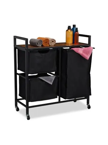 Verstaue Deine Schmutzwäsche ordentlich bis zum nächsten Waschgang. 3 ausziehbare Wäschekörbe ermöglichen das Vorsortieren von Schmutzwäsche, während eine Ablage zusätzlichen Stauraum für Handtücher, Waschmittel uvm. bietet. Dank der 4 Rollen und Feststellbremsen kannst Du den Wäschesammler einfach bis zur Waschmaschine transportieren. Das Industrial Design macht die praktische Kombination aus Wäschesortierer und Badregal zum Hingucker in Deinem Schlaf- oder Badezimmer.Wäschekorbregal im Detail – Maße H x B x T: ca. 78 x 72,5 x 30,5 cm / ca. 7 kg – Ablagefläche B x T: ca. 72,5 x 30,5 cm – Traglast Ablagefläche: max. 10 kg – Fassungsvermögen 2 kleine Wäschesacke: ca. 14,5 l – Fassungsvermögen großer Wäschesack: ca. 30 l – Material: MDF, Baumwolle, Eisen – Farbe: Schwarz, DunkelbraunWäscheschrank im Industrial-Design – Platzsparende Kombi aus Regal und Wäscheaufbewahrung – Inklusive Ablagefläche für Handtücher, Deko und Waschmittel – Mit drei herausziehbaren Wäschekörben in 2 versch. Größen – Möbelstück für Badezimmer oder Schlafzimmer im Industrial Design – Leichter Transport dank 4 Rollen und 2 Feststellbremesen – Ordnungshelfer zum Vorsortieren Deiner SchmutzwäscheLieferumfang – 1x Wäschekorbregal in Einzelteilen – Inklusive Anleitung und Montagematerial – Dekoartikel sind nicht im Lieferumfang enthalten