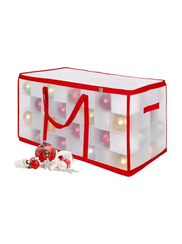 Mit der Kugelkiste organisierst Du Deinen Weihnachtsschmuck übersichtlich und vor Staub und Beschädigungen geschützt. Die Christbaumkugelbox bietet Platz für zahlreiche Weihnachtskugeln und verfügt über verstellbare Trennwände zur Anpassung an Deko in verschiedenen Größen. Dank des transparenten Designs hast Du einen schnellen Überblick über den Inhalt der Weihnachtskugelkiste und die Tragegriffe ermöglichen einen bequemen Transport zum Tannenbaum.Weihnachtskugel Aufbewahrungsbox im Detail – Größe 1 H x B x T: ca. 18 x 36 x 36 cm / ca. 0,6 kg – Größe 2 H x B x T: ca. 36 x 36 x 36 cm / ca. 1 kg – Größe 3 H x B x T: ca. 37 x 73 x 36 cm / ca. 2 kg – Material: Kunststoff, Pappe, Vlies – In verschiedenen Farben erhältlichSortierbox für Weihnachtsbaumkugeln – Zur ordentlichen und geschützten Weihnachtskugel-Aufbewahrung – Zahlreiche Fächer bieten viel Stauraum für Weihnachtsschmuck – Verstellbare Trennwände zur Anpassung an Deko in versch. Größen – 2 seitliche Tragegriffe für bequemen Transport zum Tannenbaum – Semitransparente Kugelbox für schnellen Überblick über den Inhalt – Dank kompakter Größe platzsparend in Schrank oder Regal verstaubarLieferumfang – 1x Christbaumkugel-Aufbewahrungsbox – Weihnachtskugeln sind nicht im Lieferumfang enthalten – Dekoartikel sind nicht im Lieferumfang enthalten