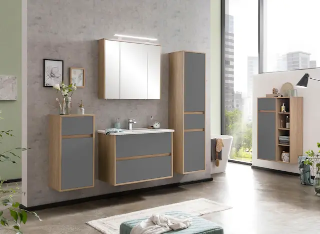 Eiche Hell Dekor mit fühlbarer Holzstruktur. Scharniere mit Softclose-Funktion. Inkl. LED-Leuchte und Schalter-/Steckdoseneinheit. Glaseinlegeböden variabel einsetzbar. Made in Germany