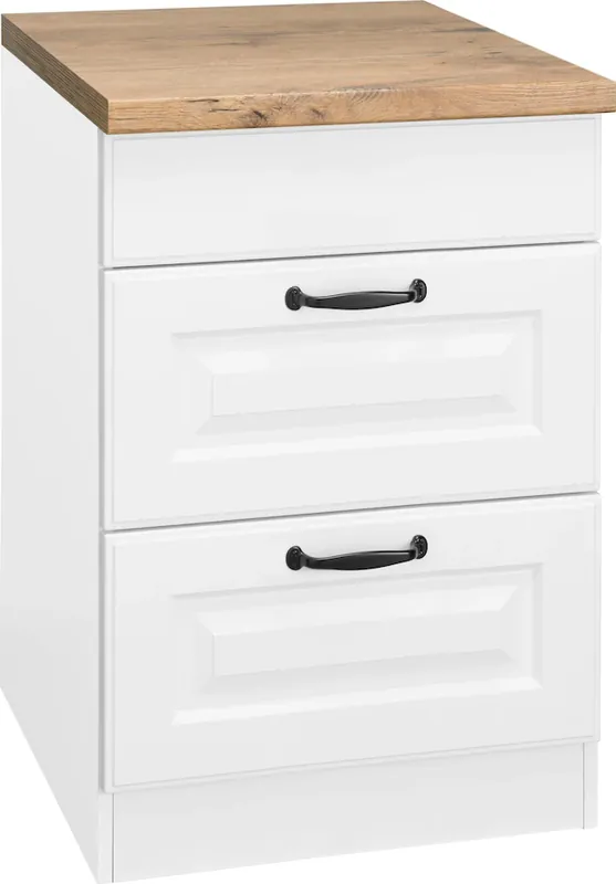 Maße (B/T/H): 60/60/85 cm. Pflegeleichte MDF Fronten mit Kassettenfräsung. Made in Germany. Beliebig um weitere Schränke erweiterbar, z.B. auch über Eck. Metallgriffe