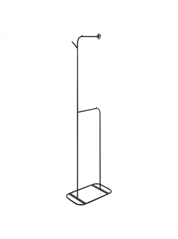 Schwarzer, freistehender Garderobenständer aus robustem Eisen. Der perfekte Kleiderständer für alle, die eine funktionale und pflegeleichte Ergänzung für Ihren Flur brauchen. Sein schlichtes, offenes Design fügt sich mühelos in moderne Einrichtungen ein, erweitert optisch den Raum und erfüllt gleichzeitig seine Aufgabe. So liefert er genügend Platz für Jacken, Mäntel, Taschen, Schals, Krawatten oder Hüte. Dank seiner schmalen, hohen Form passt er so gut wie in jede Ecke und lässt sich auch einfach an jeden Ort bringen.Details: Typ: Kleiderständer Farbe: Schwarz Material: Eisen Finish: Gefärbt Haken: 2Dimensions: Fuß: 48×20 Tiefe: 30 cm Breite: 48 cm Höhe: 171 cm Gewicht: 1 kgSie kaufen: 1 x GarderobenständerProduktvorteile: Minimalistischer, skandinavischer Stil, Klassisches Design, Passt wunderbar zu jedem Einrichtungsstil, Handgefertigte Präzision, Hochwertiges MaterialMontage: Nicht montiert. 5 – 15 Min.Pflegeanleitung:Eisen: 1.Bitte ausschließlich handelsübliche, milde Reinigungsmittel und weiche Tücher verwenden, wobei feuchte Stellen sofort trocken gerieben werden sollten 2.Vermeiden Sie scheuernde Reiniger, da diese die Oberfläche beschädigen können 3.Bei Chrom und Kupfer regelmäßig mit speziellen Pflegemitteln polieren.