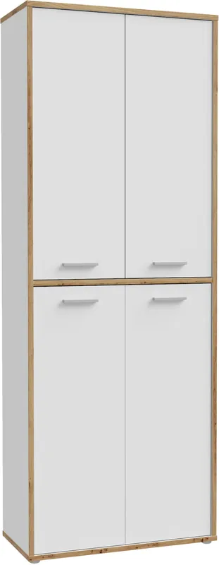 Maße: B84,5 x T41,5 x H226,4 cm. Mit 4 Drehtüren und 5 variablen Einlegeböden für flexiblen Stauraum.. Modernes Design in Weiß und Artisan Eiche, passt zu jedem Einrichtungsstil.. FSC®-zertifizierter Holzwerkstoff. Pflegeleichte Oberflächen, einfach zu reinigen und zu erhalten.