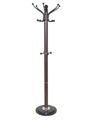 Stabiler, großer Kleiderständer aus Stahlrohr, mit einer braunen Folienbeschichtung in Holz-Nachbildung. Oben 6 Doppelkleiderhaken, in der Mitte mit 4 Taschen-/Huthaken. Alle Haken aus Stahlrohr, mit runden Knöpfen bestückt. Der Standfuß aus zwei übereinander gelegte Marmorplatten, sorgt für große Standfestigkeit. Gewicht ca. 13,5 kg. Lieferung vom Kleiderständer erfolgt zur Selbstmontage, inklusive Aufbauanleitung. Maße ca. cm: (B/H/T) 47/176/47.- Farbe: braun Holz-Nachbilung- 6 Doppelkleiderhaken und 4 Taschenhaken- Maße ca. cm: (B/H/T) 47/176/47- Mit Marmorsockel
