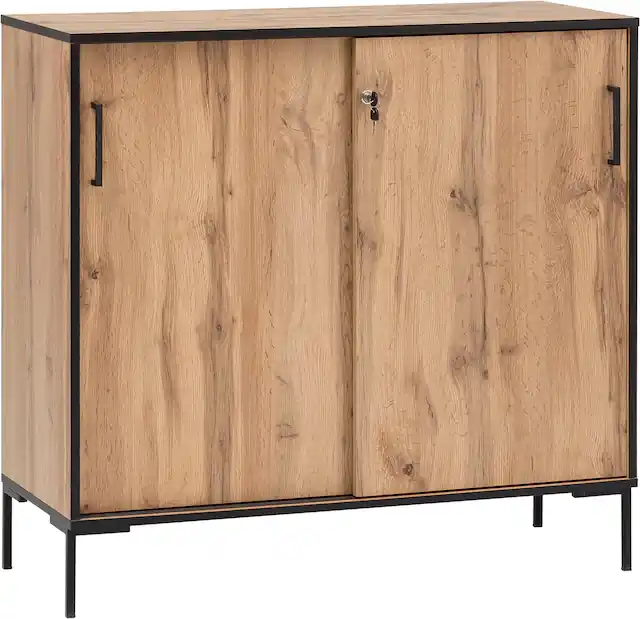 Maße: B100,1 x T41 x H96,6 cm. Landhausstil in Eiche Dekor und Weiß, passt perfekt zu deinem Zuhause.. 2 abschließbare Schiebetüren bieten sicheren Stauraum.. Die melaminharzbeschichtete Oberfläche ist langlebig, kratzfest & pflegeleicht.. Made in Germany: Dieses Produkt ist in Deutschland gefertigt und besticht durch seine solide Verarbeitung.