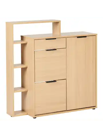 Schmaler, halbhoher Flur-Mehrzweckschrank mit Regal. Dieses Sideboard punktet mit seiner kompakten Form und einem durchdachten Design, das Ihnen unterschiedliche Ablagemöglichkeiten zur Verfügung stellt. Es besitzt eine geräumige, leichtgängige Schublade auf Metallschienen sowie zwei praktische Schuhkipper. Dinge, die Sie gerne außerhalb der Sichtweite halten möchten, finden Ihren Platz auf den beiden Ablagefächern, die sich hinter der Schranktür verbergen. Die schwarzen Metallgriffe erleichtern den Zugriff auf den gesamten Schrankinhalt. Ergänzend besitzt der Mehrzweck-Schuhschrank auch offene Regalfächer, die zusätzliche Abstellfläche für Dekoartikel oder andere Kleinigkeiten bieten. Die Kunststoffbeschichtung sorgt für angemessene Pflegeleichtigkeit, während die helle Holzoptik für einen zeitlosen Look sorgt.Details: Typ: Schuhschrank Stil: Modern Farbe: Braun Material: Faserplatte Tischplattenmaterial: Holzwerkstoff Finish: Papierfurnier Schutzkappen / Filzgleiter: Nein Volumen: für 4 Paar SchuheDimensions: Tiefe: 29 cm Breite: 98 cm Höhe: 100 cm Gewicht: 28 kg Max. Belastung der Oberplatte: 10 kgSie kaufen: 1 x SchuhschrankProduktvorteile: Passt wunderbar zu jedem Einrichtungsstil, Modernes Design, Holzähnliches Finish für einen möglichst naturnahen Look, Qualitativ hochwertiges Material, Stabile und solide Konstruktion, Für die optimale Pflege schützen Sie die Oberfläche mit Untersetzern und Platzsets vor Hitze und Feuchtigkeit. Praktischer, großer StauraumMontage: Nicht montiert. 45 – 60 Min.Zusatzinformationen: Bitte beachten: Aus Sicherheitsgründen muss das Produkt an der Wand montiert werden.Pflegeanleitung:Faserplatte: 1.Bitte ausschließlich milde Reinigungsmittel und weiche Tücher verwenden. Feuchte Stellen sofort trocken reiben.