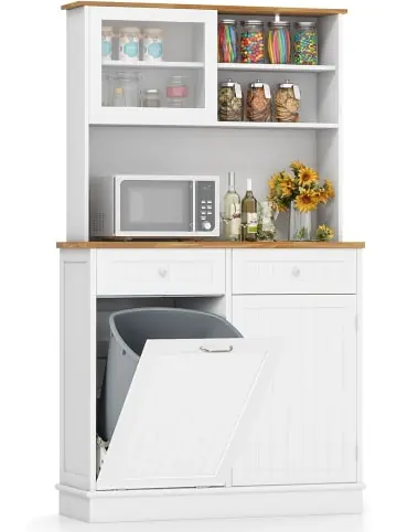 Beschreibung: Mit einem großen Fassungsvermögen kann dieser Müllschrank bis zu 45 L Abfall aufnehmen, um Ihre täglichen Bedürfnisse zu erfüllen. Zusätzlich haben wir einen weiteren Aufsatz, zwei Schubladen und einen Seitenschrank hinzugefügt, der die Kategorisierung und Aufbewahrung aller Küchenutensilien erleichtert. Der Schrank besteht aus hochwertigen Materialien, um Zuverlässigkeit und Langlebigkeit zu gewährleisten. Kippschutz für zusätzliche Sicherheit. Alle Regale sind verstellbar, um die Aufbewahrung unterschiedlich großer Gegenstände zu ermöglichen. Verwenden Sie ihn als Kücheninsel, als Wäscheschrank im Waschraum oder auch als Aufbewahrungsschrank oder kleine Bar im Wohnzimmer.Eigenschaften: 45 L kippbarer Müllschrank beseitigt unangenehme Gerüche und Unordnung Abgerundete Ecken für zusätzliche Sicherheit für Sie und Ihre Familie Kabelöffnung zur einfachen Kabelverwaltung Aus hochwertigen Materialien für Langlebigkeit und Robustheit gefertigt Oberschrank mit Glastür zum leichten Auffinden von Gegenständen 2 herausziehbare Schubladen mit Schienen und Knöpfen für einfachen Zugang zu Besteck Sicherheits-Anti-Kipp-Vorrichtungen zur Wandbefestigung In 3 Positionen verstellbare Regale mit 10 cm oder 3 cm Höhenverstellung pro Ebene Material: MDF, Gummiholz, Sicherheitsglas Gesamtmaße: 100 x 34 x 172 cm Maße der Arbeitsplatte: 100 x 32 cm Innenmaße der Schublade: 39 x 29 x 8 cm Gesamttragfähigkeit: 125 kg Nettogewicht: 40 kgLieferungsumfang: 1 x Küchenschrank 1 x AnleitungAchtung! Die Lieferung umfasst 2 Pakete, die nicht notwendigerweise mit demselben Spediteur verschickt werden und nicht unbedingt zur gleichen Zeit ankommen.