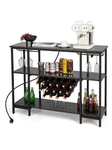 Beschreibung: Sie suchen ein Weinregal, das abwechslungsreichen Stauraum bietet, eine integrierte Ladestation bietet und für verschiedene Szenarien geeignet ist? Suchen Sie nicht weiter! Dieses Weinregal ist mit 3 großen Regalen, 2 Glashaltern und 15 Flaschenregalen ausgestattet und bietet ausreichend Platz für die ordentliche Aufbewahrung Ihrer Küchenutensilien, Essgeschirr, Glaswaren, Wein, Schüsseln und Gewürze. Außerdem verfügt es über eine integrierte Ladestation mit 2 Wechselstromsteckdosen (125 V/12 A) und 2 USB-Anschlüssen (5 V/2 A), um Ihre Smartphones, Tablets und Kleingeräte bequem aufzuladen. Einerseits gewährleisten die verstellbaren Fußpolster die Stabilität auf jedem Untergrund, während die Holzmaserung andererseits für einen exquisiten Touch sorgt.Eigenschaften: 3 große Regale, 2 Glashalter und 15 Flaschenregale für ausreichend Stauraum Integrierte Ladestation mit 2 AC-Steckdosen und 2 USB-Anschlüssen 143 cm langes Netzkabel für flexible Platzierung Vielseitiges Design ergänzt jede Einrichtung Verstellbare Fußpolster für Stabilität auf jedem Untergrund Einfache Montage mit detaillierter Anleitung Glatte Oberfläche für schnelle und problemlose Reinigung Verleiht Ihrem Raum ein Design im Industriestil Material: Holzwerkstoff, Metall Gesamtmaße: 113 x 35 x 85 cm (L x B x H) Nettogewicht: 19 kg Belastbarkeit der Arbeitsplatte: 100 kg Tragfähigkeit der mittleren Ablage: 50 kg Tragfähigkeit der unteren Ablage: 40 kg Wechselstromsteckdosen: 125 V/12 A USB-Anschlüsse: 5V/2A Länge des Netzkabels: 143 cm Fassungsvermögen der Weinregale: 15 Flaschen Fassungsvermögen der Tassenablagen: 6 TassenLieferungsumfang: 1 x Weinregal 1 xHandbuch