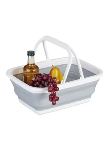 Dieser praktische Faltkorb ist ein nützlicher und universeller Helfer im Alltag. Nutze den Korb, um Deine Einkäufe zu transportieren, für einen Ausflug zum Picknicken oder zum Camping. Auf Reisen lässt sich der wasserdichte Korb auch ideal als Spülschüssel verwenden. Der pflegeleichte Tragekorb mit Henkeln ist aus einem hochwertigen Kunststoff-Mix gefertigt und überzeugt mit seiner Robustheit und Langlebigkeit. Bei Nichtgebrauch kann der Klappkorb platzsparend verstaut werden.Faltkorb im Detail – Gesamtmaße H x B x T: ca. 15,5 x 38,5 x 28,5 cm- Höhe mit Henkel: ca. 28 cm – Maße gefaltet H x B x T: ca. 6 x 38,5 x 28,5 cm – Volumen: ca. 8 L – Gewicht: ca. 0,5 kg – Traglast: ca. 10 kg – Material: PP, TPR (BPA-frei) – Farbe: Weiß, GrauFaltbarer Einkaufskorb mit Henkeln – Universell nutzbarer Tragekorb mit Henkeln – Perfekt zum Einkaufen, für Camping, Picknick uvm. – Wasserdichter Klappkorb – Auch als Spülschüssel verwendbar – Bei Bedarf zusammenfalten und platzsparend verstauen – Aus robusten und langlebigen Kunststoff gefertigtLieferumfang – 1x Camping Korb – Dekoartikel sind nicht im Lieferumfang enthalten