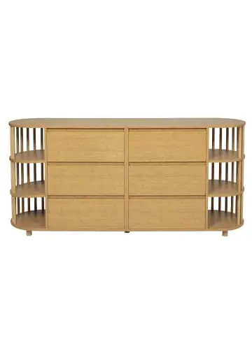 Retro-Kommode im römischen Stil | 160×40×75 cmProdukteigenschaften:Elegantes Retro-Design: Römische Säulen-Optik mit Eichenholzfurnier und BambusgitternVielseitiger Stauraum: 6 gleichgroße Schubladen + beidseitige Bambusregale mit 3 EbenenPraktische Details: Grifflose Schubladen mit abgeschrägten Kanten, 2 höhenverstellbare MittelbeineSichere Konstruktion: 6 stabile Bambusfüße mit KippsicherungHochwertige Materialien: MDF mit Bambus-Elementen für langlebige QualitätMaße: 160 × 40 × 75 cm (B × T × H)Material: MDF + BambusFarbe: EicheSchubladenmaße: 45 × 28,5 × 13 cm (B × T × H)Gewicht: 49,9 kg (netto)Tragkraft: Tischplatte 50 kg, Schubladen je 10 kgFunktionen & Besonderheiten:Beidseitig zugängliche Bambusregale für DekorationenEinfache Montage mit klar gekennzeichneten TeilenBodenfreiheit von 5 cm für einfache ReinigungVielseitig im Wohnzimmer, Flur oder Küche einsetzbarLieferumfang:2 Pakete (Kommodengestell + Zubehör)Montagewerkzeuge und AnleitungHinweis: Zur Sicherheit wird die Verwendung der Kippsicherung empfohlen. Bei fehlenden Teilen Kundenservice kontaktieren.
