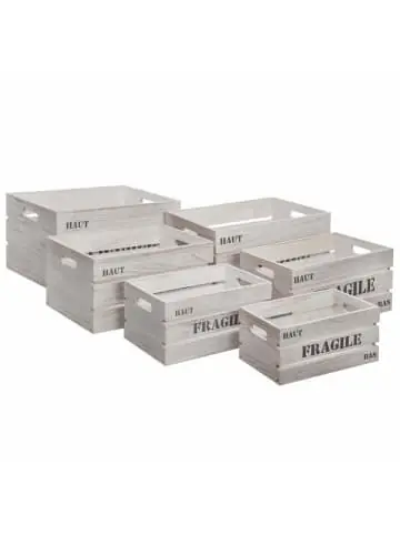 Ein Set von sechs dekorativen Boxen wird sich während der Hausreinigung als unersetzlich erweisen, kann aber auch als originelle Inneneinrichtung verwendet werden. Die Boxen ähneln klassischen Holzkisten im alten Stil. Jeder von ihnen ist aus altem Holz, in grauer Farbe bemalt. Eine einfache schwarze Inschrift erinnert an Assoziationen mit alten Aufbewahrungsboxen. Ihr Stil passt zu ungewöhnlichen Räumen — zum Beispiel im Retro-Stil mit Modernität oder anderen originellen Arrangements. Sie eignen sich für fast alles — Bücher, Zeitschriften, Spielzeug. Unabhängig von der Verwendung werden sie den Raum dekorieren und die Gäste überraschen. Sie werden als Raum genutzt, um Dinge während der Reinigung zu trennen und zu ordnen — zum Beispiel alte Zeitschriften oder Werkzeuge. Ihre Größe wurde gewählt, um sich untereinander verstecken zu können. Die Griffe, die in den Wänden geschnitten sind, machen es einfach, die Kisten zu tragen. Produkteigenschaften: Set mit 6 praktischen Aufbewahrungskisten,Boxen in hellgrau, aus Holz,Griffe für einfachen Transport,Einfache Lagerung von Boxen, man kann eine in die andere stecken,Perfekte Dekoration für Innenräume im Öko-Stil, skandinavischen Stil, Loft-Stil,Sie eignen sich gut zum Aufbewahren von z.B. Büchern, Zeitschriften usw.