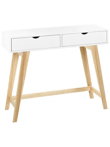 Konsolentisch mit Schubladen im skandinavischen Stil . Falls Sie einen skandinavischen oder minimalistischen Einrichtungsstil bevorzugen, wird dieser Konsolentisch mit Sicherheit zu Ihrer Wohnungseinrichtung passen. Das moderne Design des Möbels wird durch die weiße Oberfläche und die Schubladen hervorgehoben, während die Holzbeine in einem hellen Farbton für eine gemütliche Note sorgen. Mit seinem zusätzlichen Stauraum ist der Konsolentisch eine praktische Lösung für Ihr Wohnzimmer oder Ihren Flur, er kann aber auch als Schminktisch in Ihrem Schlafzimmer verwendet werden.Details: Typ: Konsolentisch Stil: Minimalistisch Farbe: Weiß Material: MDF-Platte Zusätzliches Material: Kiefernholz Material Rand: Holz Gestellmaterial: Holz Tischplattenmaterial: Holzwerkstoff Schubladen: Ja Finish: Lackiert Schutzkappen / Filzgleiter: Nein Schubladen: 2 Regalböden: NeinDimensions: Tiefe: 36 cm Breite: 101 cm Höhe: 78 cm Gewicht: 16 kg Max. Belastung der Schublade: 5 kg Max. Belastung der Oberplatte: 50 kgSie kaufen: 1x KonsolentischProduktvorteile: Praktische Schubladen mit stabilem Mechanismus, Minimalistischer, skandinavischer Stil, Hochwertiges Material, Zusätzlicher Stauraum, MultifunktionalMontage: Nicht montiert. 20 – 40 Min.Zusatzinformationen: Um die Haltbarkeit und die Ästhetik der Arbeitsplatte zu erhalten, sollte man Platzsets und Untersetzer verwenden und feuchte Stellen schnellstmöglich trocken wischen, um Produktschäden zu vermeiden.Pflegeanleitung:MDF-Platte: 1.Bitte ausschließlich milde Reinigungsmittel und weiche Tücher verwenden. Feuchte Stellen sofort trocken reiben.Kiefernholz: 1.Bitte ausschließlich milde Reinigungsmittel und weiche Tüchern verwenden. Dabei immer in Richtung der Maserung abwischen 2.Sofort nach der Reinigung abtrocknen, um zu verhindern, dass sich Wasser auf dem Produkt absetzt 3.Nur bei geölten Holzartikeln befolgen: Sie sollten nach einiger Zeit nachgeölt werden, damit sie lange in einem guten Zustand erhalten bleiben.