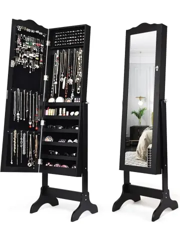 Beschreibung: Schauen Sie sich diesen abschließbaren Schmuckschrank an. Mit seinen Stützfüßen kann er aufgestellt und leicht verschoben werden, wohin Sie wollen. Der Schrankkorpus ist winkelverstellbar. Der ganzflächige Glasspiegel bietet Ihnen eine klare Sicht von Kopf bis Fuß, was perfekt für die tägliche Make-up-Routine ist. Er bietet im Inneren viel Platz zum Sortieren und Organisieren all Ihrer Schmuckstücke, und die weiche Samtauskleidung ist sinnvoll, um Kratzer sowie die Luftoxidation zu reduzieren. Außerdem ist er mit einem schönen Spezialschloss ausgestattet, damit Ihr Schmuck im Inneren gut verschlossen bleibt. Das schlichte, schöne Erscheinungsbild wird großartige zu Ihrer Inneneinrichtung passen. Dies ist der absolut schöne und praktische Schmuckschrank, nach dem Sie gesucht haben!Eigenschaften: 160 cm hohes freistehendes Design mit winkelverstellbaren Ständern Großer Spiegel aus Glas, um Ihnen eine klare Sicht von Kopf bis Fuß zu ermöglichen, was perfekt für die tägliche Make-up-Routine ist Verschließbare Tür zur sicheren Aufbewahrung von Schmuck 60 Ringschlitze, 29 Halsketten- und Armbandhaken, 6 Ablagen, 85 Ohrstecker-Schlitze und 20 Ohrringöffnungen bieten viel Platz für die Lagerung und Organisation von Schmuck Weiche Samtauskleidung im Inneren zur Reduzierung von Kratzern auf Schmuckstücken sowie der Luftoxidation Stabile und haltbare Struktur aus hochwertigen MDF-Platten Schlichtes, aber schönes Aussehen, das zu jedem Dekor passt Material: MDF, Glas, Samt Gesamtmaße: 44 x 37 x 160cm Kabinettgröße: 37 x 8,5 x 110cm Produktgewicht: 10,9 kgLieferungsumfang: 1 × Schmuckschrank 1 x Schlüssel 1 × Zubehörbeutel 1 × AnleitungAchtung: wegen Corona-kreis kann die Versantlaufzeit länger dauern werden.