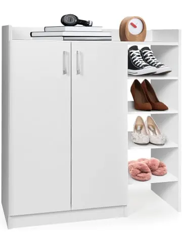 Beschreibung: Werden Sie noch vom Schuhchaos im Eingangsbereich gestört? Unser Schuhschrank ist die clevere Lösung. Mit 2-türigem Schrank und 5 offenen Fächern kann dieser Schuhregal-Organizer bis zu 11 Paar Schuhe aufnehmen. Die in 5 Positionen verstellbaren Regalböden ermöglichen eine einfache Lagerung unterschiedlicher Schuharten. Die großzügige Arbeitsplatte bietet zusätzlichen Platz für oft benötigte Gegenstände. Somit sorgt unser praktischer Aufbewahrungsschrank mit großem Stauraum für Ordnung und Sauberkeit im Raum. Die robuste Holzbauweise verleiht große Stabilität und garantiert eine langlebige Nutzung. Möchten Sie zudem Bücher, Kleidung, Dekorationen und weitere Kleinigkeiten verstauen, ist dieser moderne und vielseitige Holzschrank die perfekte Wahl!Eigenschaften: Breite Arbeitsplatte zum bequemen Zugriff auf Alltagsgegenstände 2-türiger Schrank und 5 offene Fächer für ordentliche Schuhaufbewahrung 5-fach verstellbare Regalböden für verschiedene Aufbewahrungsbedürfnisse Holzwerkstoff gewährleistet hervorragende Stabilität und lange Lebensdauer Metallgriffe zum einfachen Öffnen und Schließen der Türen Geeignet für Flur, Wohnzimmer, Schlafzimmer, Arbeitszimmer usw. Modernes und schlichtes Design fügt sich perfekt in jeden Einrichtungsstil ein Glatte, wasserfeste Oberfläche für einfache Reinigung Leichte Montage dank detaillierter Anleitung Material: Holzwerkstoff Gesamtmaße: 83 x 31,5 x 91 cm (L x B x H) Nettogewicht: 24,5 kg Tragfähigkeit der Oberseite: 40 kg Tragfähigkeit jedes offenen Fachs: 10 kg Tragfähigkeit jedes Regals im Schrank: 20 kgLieferungsumfang: 1 x Schuhschrank 1 x Anleitung