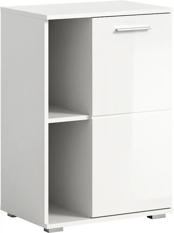 Maße ca. (B/T/H): 55/37/79 cm. 1 Tür, 2 höhenverstellbare Einlegeböden, 1fester Konstruktionsboden, 2 offene Fächer, 3 Fächer hinter der Tür. hochwertig verarbeitete, pflegeleichte MDF-Fronten mit Rillenfräsung. Ideal, nicht nur für den Eingangsbereich, geeignetes funktionales Möbel zur Aufbewahrung und zum Verstauen von Schuhen, Kleidung, Accesoires uvm.. Das Möbel besteht aus FSC®-zertifiziertem Holzwerkstoff zum Schutz der Wälder