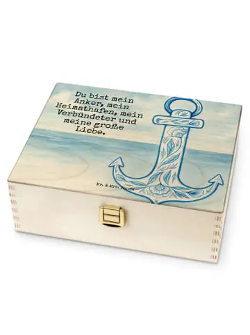 Suchst du eine hübsche und praktische Lösung für deine TeeMenschmlung? Unsere Teekiste von Mr. & Mrs. Panda ist die Antwort. Bedruckt mit den wunderschönen Motiven von Mr. & Mrs. Panda bringt sie Freude in jede Teestunde. Die Box ist nicht personalisierbar, überzeugt aber durch fasertiefen wunderschönen Druck und umweltfreundliche & nachhaltige Tinte. Die dekorativen Layouts und Vorlagen machen das Öffnen zur Freude. Hergestellt aus 7 mm Birke-Schichtholz an den Kanten gezinkt, Farbe: Natur, wirkt die Box edel und gleichzeitig gemütlich. Der Verschluss und die Einschlag-Scharnieren (nicht abschließbar) halten den Inhalt sicher. Die kompakte Bauweise und das angenehme Gewicht machen die Box alltagstauglich. Innen findest du sechs Fächer, perfekt für tee beutel halter, tee organizer oder teebeutel aufbewahrungsbox. Sortiere deine Lieblingstees nach Geschmack oder Anlass und hab immer alles griffbereit. Ob als Geschenk oder fürs eigene Regal – diese Aufbewahrungsbox für Teebeutel ist praktisch, dekorativ und nachhaltig produziert. Entdecke Ordnung mit Stil.Anker Blau – Heimathafen der Liebe: Der Anker steht fest im Sturm, ein Leuchtturm der Hoffnung in einer Welt voller Unwägbarkeiten, genau das verkörpert dieses liebevoll gestaltete Motiv von Mr. & Mrs. Panda. Der Elan und die Farbintensität des blauen Ankers, kunstvoll verziert, rufen Bilder von tiefer Verbundenheit und schützender Liebe hervor. Der Spruch ‚Du bist mein Anker, mein Heimathafen, mein Verbündeter und meine große Liebe‘ trägt eine Botschaft von unermesslicher Tiefe und emotionaler Reichweite. Es geht um die Kraft der Liebe, die uns Wurzeln gibt, und die Freiheit, die uns Flügel verleiht. In Zeiten, in denen das Leben uns auf die Probe stellt, erinnert uns dieses Motiv daran, dass wir niemals wirklich verloren sind, sofern wir einen Anker in jemandem gefunden haben, der unser Herz berührt.Freude verschenken: Die Small World Kollektion von Mr. & Mrs. Panda steht für die Liebe zur Natur und ihren kleinsten Geschöpfen. Hier verschmelzen handgezeichnete Aquarellbilder mit humorvollen und lebensbejahenden Sprüchen zu einer harmonischen Einheit, die jeden Raum erhellt. Egal, ob du dein Zuhause dekorieren oder einem besonderen Menschen eine Freude machen möchtest – unsere Produkte sind eine Quelle der Inspiration und des Lächelns. Die Vielfalt dieser Kollektion spiegelt sich in den zahlreichen Tiermotiven wider, die jedem Betrachter ein Stückchen dieser Small World näherbringen. Tauche ein in ein Universum voller Liebe, Humor und gute Laune, die jede Ecke deines Lebens verschönern.Unser Produkt wird gesucht als: Teedose, schichtholz teekiste, Box für Teebeutel, Tee Organizer, Teebeutelbox, birke teekiste, teebeutelbehälter, tee organizer holz, teekiste holz, tee box holz, Tiermotive, Teebox Birkenholz, holz teedose, Holzteebox, Teebeutel Behälter, Box für Tee, Tee Box, Teebehälter, Teebeutel Aufbewahrungsbox, teebeutelbox holz, teekiste mit deckel, teebeutel halter holz, Teekasten, teebox mit unterteilung, Tee Sortierbox, Tee-Aufbewahrungsbox, Teebeutel Organizer, Teebeutel Box, teedose mit deckel, Aufbewahrungsbox für Teebeutel, Holz Teedose Fächer, Teebeutel Aufbewahrung, teekiste mit unterteilung, teebox holz, Panda Teedose, Teeaufbewahrung, Tee Beutel Halter, teekiste mit fächern, Teebox, Tee Organizer Box, Teebox mit Verschluss, Teeaufbewahrungsbox, teekiste mit verschluss, Teebox für Teebeutel, Teebox Natur, Teeschachtel, holzkiste tee, Teebeutel-Box, Holzteekiste, Geschenk für Paare, Tee Aufbewahrung, Teebeutel Aufbewahrung Holz, Teedose 6 Fächer, Teekiste, teebehälter mit fächern, Aufbewahrungsbox Tee, teebehälter holz, Aufbewahrungsbox für Tee, Vorratsbox Tee, teedose mit fächern, Aufbewahrung Tee, teedose holz, tee aufbewahrung holz, Teebox Birke, Holz Teebox, Teedose mit Motiv, Teedose aus Holz, Tee Kiste, holz teebeutelbox, Teekästchen, teebox mit deckel, teebox mit fächern