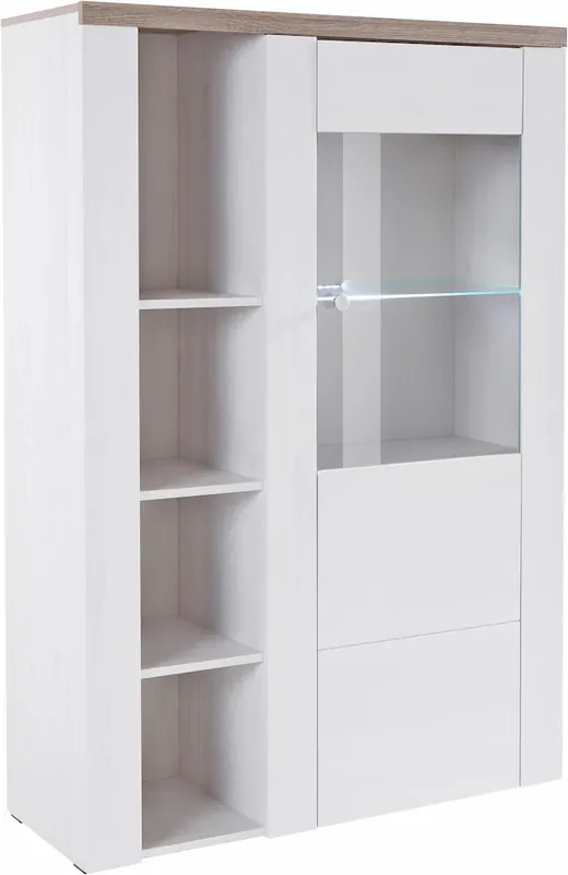 Mit FSC®-zertifiziertem Holzwerkstoff und Ganzmetall-Scharnieren überzeugt die Anrichte mit Eleganz und Langlebigkeit.. Die dekorative Rahmenoptik verleiht der Standvitrine einen eleganten und zeitlosen Look, der sich in verschiedene Einrichtungsstile einfügt.. Durch die Kombination aus Holz und Glas verleiht es der Vitrine eine zeitlose und hochwertige Ausstrahlung und es ermöglicht Ihnen, Ihre Lieblingsstücke stilvoll zu präsentieren. Die Vitrine ist in mehreren Farben erhältlich. Wählen Sie zwischen klassischem Weiß und warmen Holznuancen, um das Möbelstück perfekt an Ihr Zuhause anzupassen.. Entdecken Sie die Vielfalt der Serie – Egal, ob Sie zusätzlichen Stauraum benötigen, Ihre Wohnräume verschönern möchten oder einfach nur nach einem neuen Blickfang suchen.