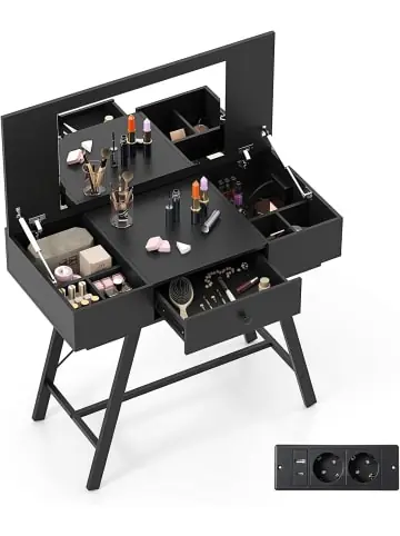 Beschreibung: Unser 2-in-1 Schminktisch verwandelt sich mühelos von einem Schreibtisch zu einer geräumigen Schminkstation mit seinem klappbaren Design. Die Tischplatte öffnet sich und enthüllt einen Spiegel und zusätzlichen Stauraum, darunter 6 Fächer für Kosmetik und Schmuck sowie eine praktische Schublade für tägliche Essentials. Bleiben Sie mit der integrierten Ladestation aufgeladen und halten Sie Kabel dank eines versteckten Kabellochs aus dem Blick. Sein stabiler Metallrahmen mit X-Verstrebung sorgt für hohe Stabilität und die mitgelieferten Wandmontagesets bieten zusätzliche Sicherheit. Mit einer Mischung aus rustikalem Charme und modernen Linien bietet der Tisch sowohl Funktionalität als auch Stil für Ihren Raum.Eigenschaften: 2 große und 4 kleine versteckte Fächer für Ihre Beauty-Produkte Eine tiefe Schublade fasst Ihre täglichen Essentials ohne die Notwendigkeit, die Tischplatte anzuheben Multi-Port-Ladestation unterstützt verschiedene Arten von Geräten Kabelmanagementloch verhindert Kabelsalat Verstärkter Metallrahmen und X-Verstrebung erhöhen die Haltbarkeit Anti-Kipp-Kits sichern den Schminktisch an der Wand und verhindern das Umkippen Material: Metall, Holzwerkstoff Gesamtabmessungen: 96,5 × 46,5 × 80,5 cm Maximale Höhe: 124 cm Maße des Spiegels: 60 × 36,5 cm Maße jedes großen Fachs: 25 × 25 × 13 cm (L x B x H) Maße jedes kleinen Fachs: 12 × 16,5 × 13 cm (L x B x H) Innere Größe der Schublade: 35 × 40 × 9,5 cm (B x T x H) Kabellänge: 145 cm Nettogewicht: 24,5 kg 2 AC Steckdosen: 230V AC/Max 10A 1 USB & 1 Type-C Anschluss: 5V/2,4A insgesamtLieferungsumfang: 1 x Schminktisch 1 x Anleitung