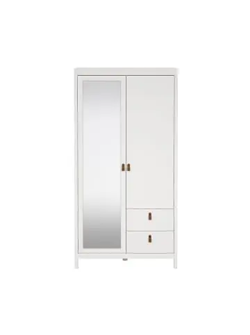 Madrid Kleiderschrank 199x103x59cm, 1 Tür, 1 Spiegeltür, 2 Schubladen weiß. Der Kleiderschrank Madrid vereint Funktionalität und stilvolles Design mit einer weißen Oberfläche und einem Spiegel an einer Tür. Der Schrank verfügt über eine geräumige Kleiderstange und zwei praktische Schubladen zur Aufbewahrung von Kleidung und Accessoires. Die Spiegeltür ermöglicht eine schnelle Überprüfung Ihres Aussehens, was Platz und Zeit spart. Die schönen, dezenten Holzgriffe verleihen dem Schrank einen nordischen Touch und passen gut in moderne Wohnungen. Aufgrund seiner Größe eignet sich der Schrank sowohl für kleine als auch für mittelgroße Räume, in denen sowohl Stauraum als auch eine Spiegelfunktion erforderlich sind.