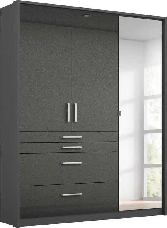 Drehtürenschrank in Hochglanzoptik inkl. Passepartout mit 4 praktischen und unterschiedlich großen Schubkästen. Durchdachte Einteilung in der oberen Schublade schafft Ordnung für kleinere Accessoires im Kleiderschrank. Schrank mit Schubladen für zahlreichen Stauraum-Ideen. Fachböden und Kleiderstangen im Kleiderschrank können individuell eingesetzt und in der Höhe verstellt werden. rauch Kleiderschränke sind 100% Made in Germany, ausgezeichnet mit dem Blauen Engel und dem Goldenen M