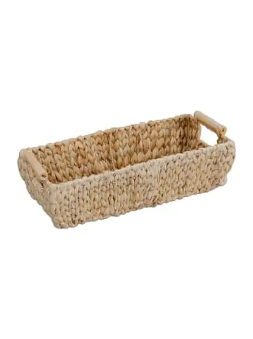 Mit dem geflochtenen Aufbewahrungskorb holst Du Dir einen praktischen und zugleich dekorativen Ordnungshelfer nach Hause. Ob als Badezimmerkorb für Kosmetik und Toilettenpapier, Regalkorb für Socken und Unterwäsche im Schlafzimmer oder Utensilienkorb im Wohnzimmer, in dem Flechtkorb finden alle Kleinigkeiten des Alltags übersichtlich einen Platz. Dabei überzeugt der Korb aus natürlicher Wasserhyazinthe mit seinem dekorativen, geflochtenen Design in Skandi-Optik.Aufbewahrungskorb im Detail – Maße H x B x T: ca. 13,5 x 43 x 19 cm – Boden innen B x T: ca. 35 x 11,5 cm – Gewicht: ca. 670 g – Material: Wasserhyazinthe, Eisen – Farbe: NaturVielseitiger Flechtkorb für Bad, Küche und mehr – Dekokorb für Wohn-, Schlaf- und Badezimmer – Ideal für Kosmetik und Toilettenpapier im Bad – Auch zum Verstauen von Accessoires, Utensilien uvm. – Großer, eckiger Korb in angesagtem Skandi-Design – Geflochtener Dekokorb aus nachwachsendem MaterialLieferumfang – 1x Aufbewahrungskorb – Dekoartikel sind nicht im Lieferumfang enthalten