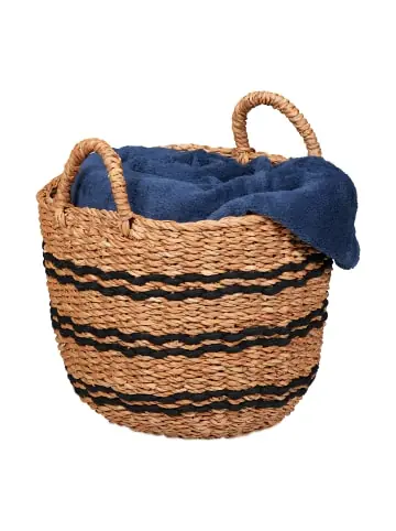 Mit diesem Ordnungskorb aus Seegras mit Juteakzenten sorgst Du nicht nur für Ordnung, sondern schaffst auch einen tollen Blickfang im Boho-Stil. In dem geflochtenen Badorganizer finden Badartikel, Handtücher, Decken und Kleinteile Platz. Mit den zwei integrierten Griffen kann der Badkorb einfach angehoben und transportiert werden. Nutze den vielseitigen Aufbewahrungskorb als Ordnungshelfer im Wohnzimmer, Bad oder Schlafzimmer.Aufbewahrungskorb im Detail – Maße Korb H x D: ca. 28 x 35 cm – Höhe mit Griffen: ca. 35 cm – Gewicht: ca. 0,6 kg – Material: Seegras, Jute – Farbe: Natur, SchwarzGeflochtener Dekokorb aus Seegras und Jute – Zum Verstauen von Badartikeln, Decken, Kleinteilen uvm. – Ideal für mehr Ordnung im Bad, Wohn- und Schlafzimmer – Allzweckkorb aus natürlichem Seegras mit Jutestreifen – Geflochtenes Design ist toll für Einrichtungen im Boho-Stil – Integrierte Griffe für leichtes Hochheben und TransportierenLieferumfang – 1x Utensilienkorb – Dekoartikel sind nicht im Lieferumfang enthalten