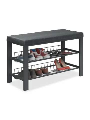 Ob in der Diele, im Wohn- oder Schlafzimmer: Die Schuhbank fügt sich in jede Räumlichkeit dezent ein. Die Sitzpolsterung mit Stoffbezug ist nicht nur dekorativ, sondern überzeugt auch mit Sitzkomfort – zusammen mit dem Metallgestell entsteht ein moderner Materialmix. So kannst Du bequem sitzen, während Du Dir die Schuhe an- oder ausziehst. Auf den 2 Ebenen der Schuhablage finden 6 bis 8 Paar Schuhe übersichtlich. Platz, wodurch Chaos im Flur verhindert wird.Schuhbank mit Polster im Detail – Maße gesamt H x B x T: ca. 50,5 x 82 x 33 cm – Fläche je Ablage B x T: ca. 73 x 25,5 cm – Traglast: max. 300 kg – Gewicht: ca. 7,5 kg – Material: Eisen, MDF, Polyester – In verschiedenen FarbenSchuhregal zum Sitzen – Schuhaufbewahrung im Flur, Wohn- oder Schlafzimmer – Auf 2 Ablagen bis zu 8 Paar Schuhe griffbereit verstauen – Stabiles Metallgestell sorgt für sicheren Stand – Dank bequemem Polster auch zum Sitzen geeignet – Füße mit Bodenschonern verhindert KratzerLieferumfang – 1x Schuhbank in Einzelteilen – Mit Montagematerial und Anleitung – Dekoartikel sind im Lieferumfang nicht enthalten