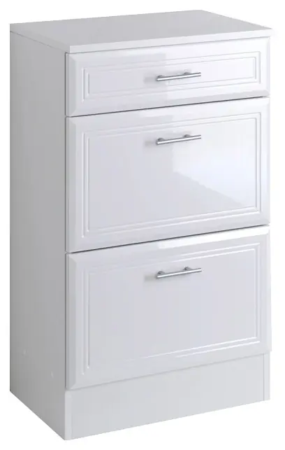 Hochglanzfronten mit eleganter Fräsung. Türanschlag wechselbar. In 2 Farbvariationen. Badmöbel Made in Germany. 5 Jahre Herstellergarantie auf alle Möbelteile