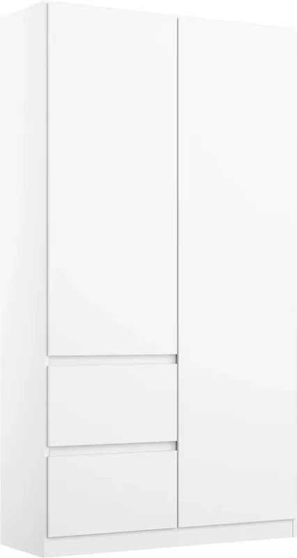 Schubkästen mit Griffmulde. Push-to-open-Funktion. Kleiderstange und Beschläge aus Metall. Grifflose Front. Made in Germany!