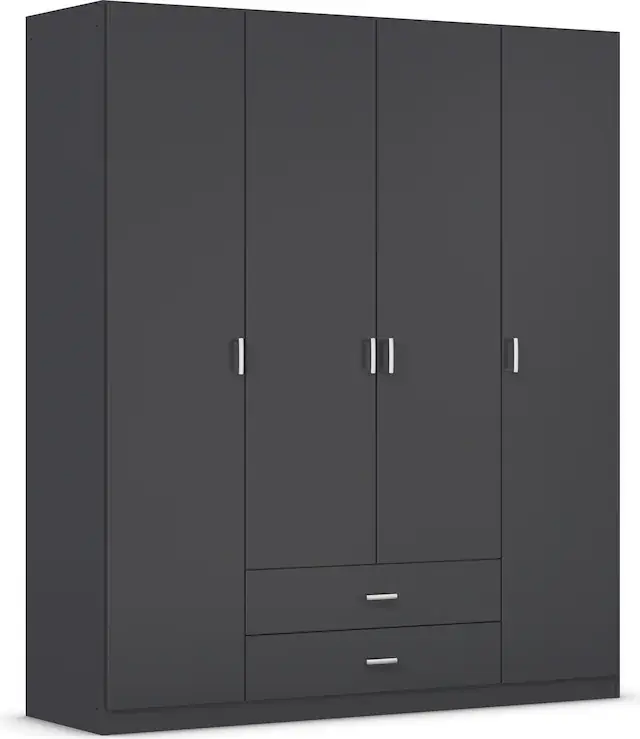 Geräumiger Drehtürenschrank in schlichtem Design. In verschiedenen Breiten und Farben erhältlich. Clevere Stauraumlösung durch geräumige Schubladen an der Schrankfront. Fachböden und Kleiderstangen können individuell eingesetzt und in der Höhe verstellt werden. 100% Made in Germany, ausgezeichnet mit dem Blauen Engel und dem Goldenen M