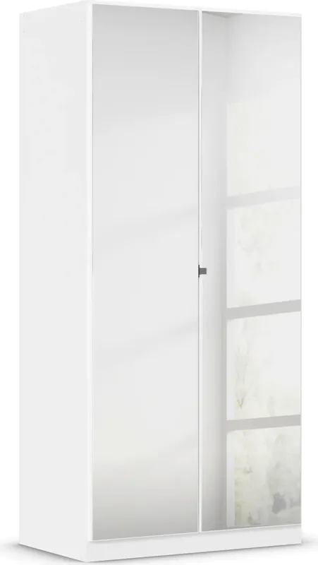 Klassischer Drehtürenschrank mit Vollspiegel-Fronten in verschiedenen Breiten. Lässt kleine Räume optisch größer wirken. Praktischer Inneneinteilung bietet ausreichend Stauraum. Die integrierten Fachböden und Kleiderstangen können individuell eingesetzt und in der Höhe verstellt werden. 100% Made in Germany, ausgezeichnet mit dem Blauen Engel und dem Goldenen M